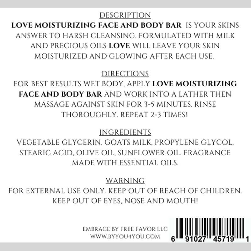 LOVE MOISTURIZING FACE AND BODY SOAP is your skins answer to harsh cleansing. Formulated with milk and precious oils LOVE will leave your skin moisturized and glowing after each use.