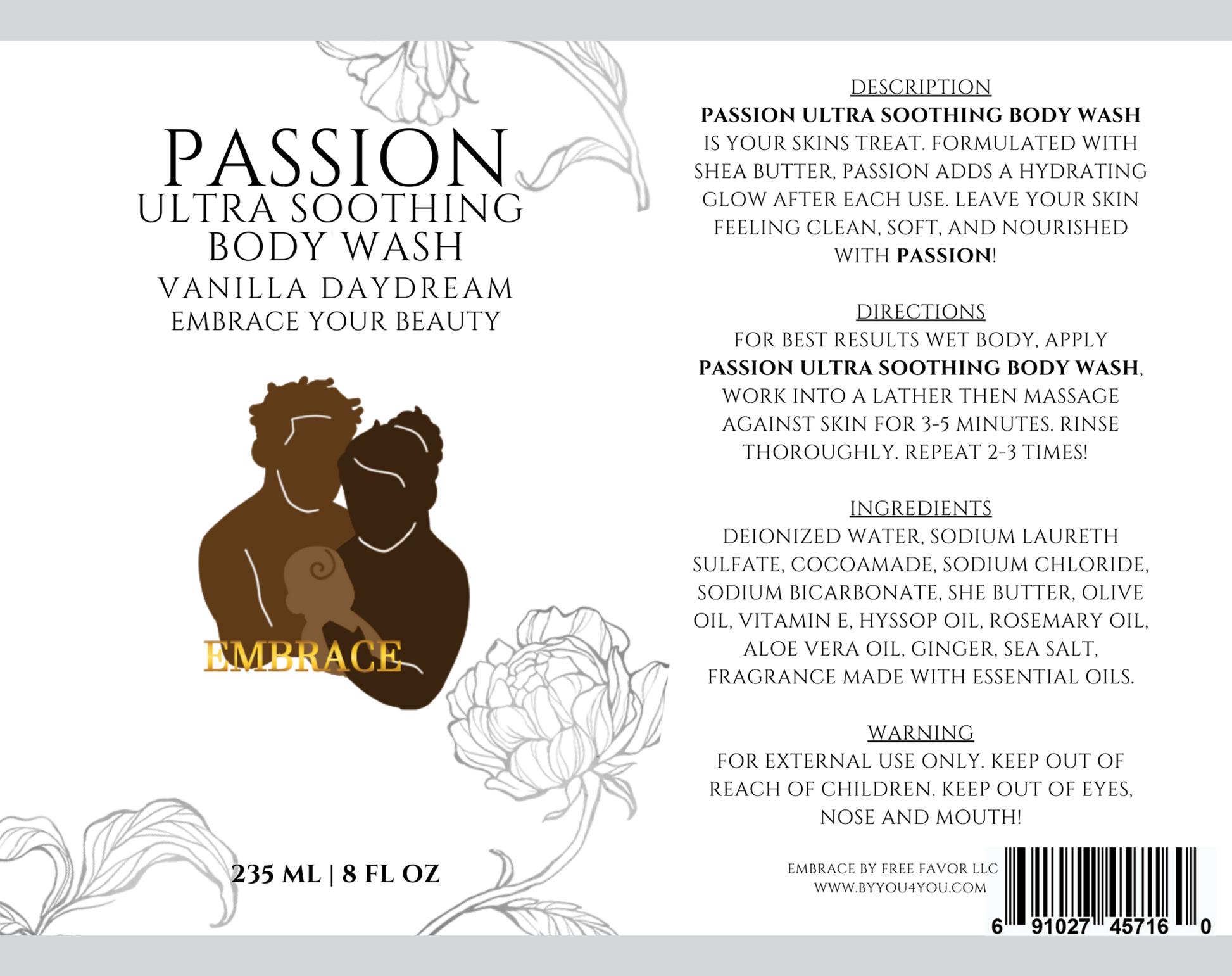 PASSION ULTRA SOOTHING BODY WASH is your skins treat. Formulated with shea butter, PASSION adds a hydrating glow after each use. Leave your skin feeling clean, soft, and nourished with PASSION!